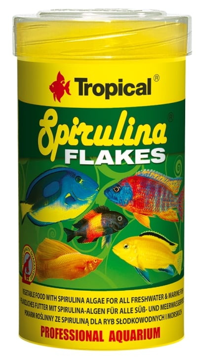 Tropical Spirulina Flakes is a food in the form of flakes with the addition of spirulina (6%) for everyday feeding of herbivorous and omnivorous fish. Spirulina platensis is the source of easily-assimilable protein, vitamins and trace elements, which ensure proper growth, development and excellent condition. It is also rich in natural carotenoids, which intensify colours and positively affect many physiological processes, including growing and breeding. Roughage regulates metabolism and prevents constipations. The addition of zeolite promotes a healthy digestive system and the release of toxins from fish’s bodies.